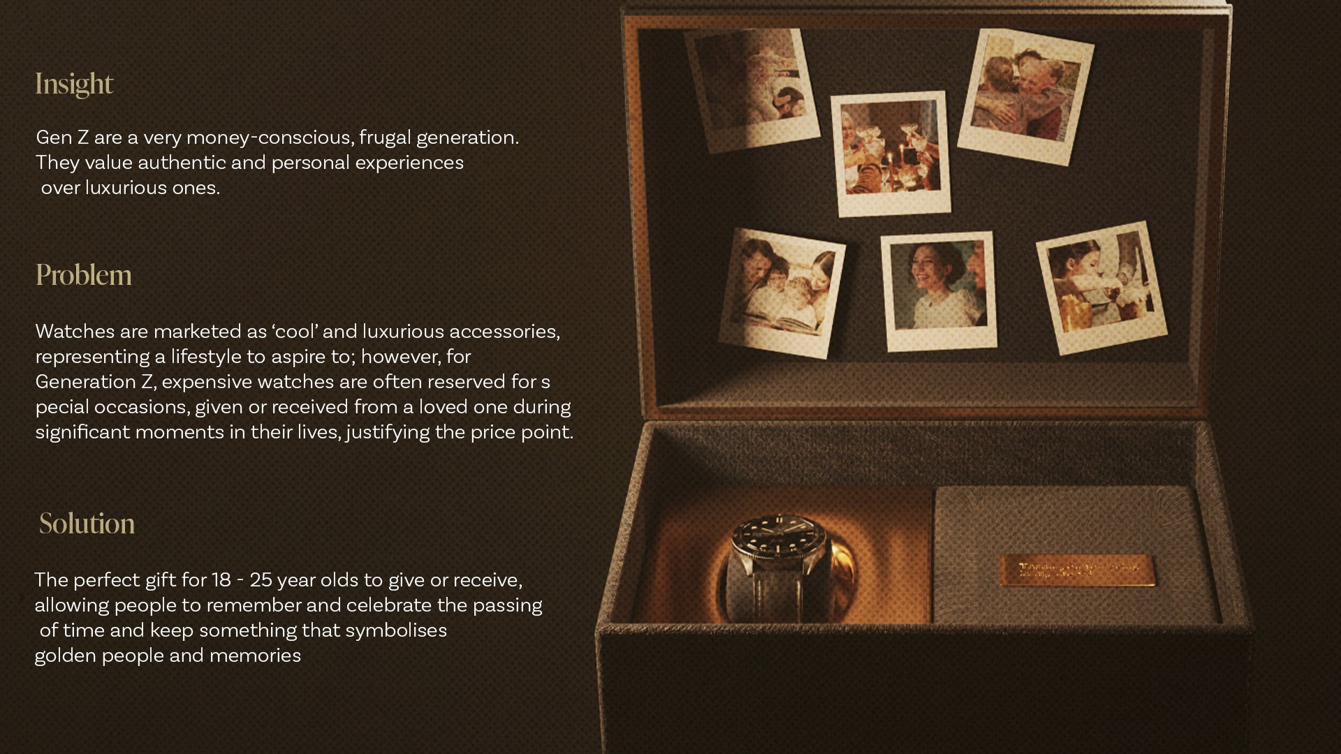 Visuals and animation that showcases the watch as a beautifully crafted peice, made through skill and memories allowing you to remember both the current time, and the golden times. Showcasing it as the perfect companion for whatever the future holds.